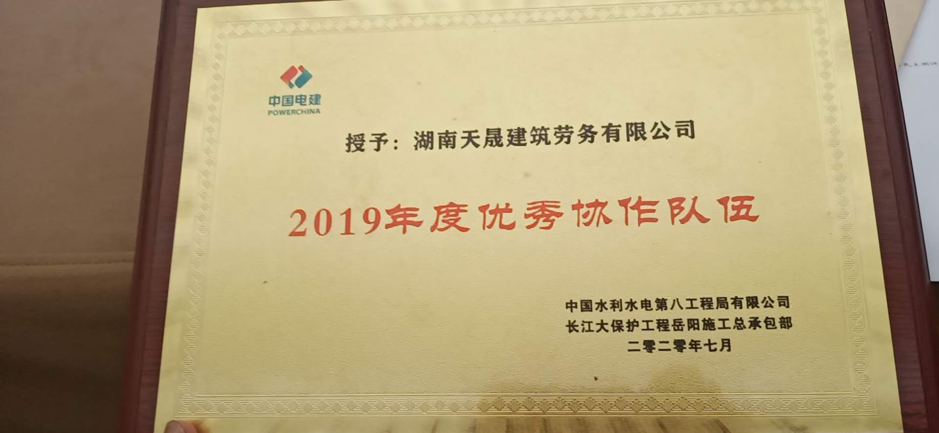 2020年7月公司榮獲中國(guó)水利水電第八工程局有限公司——長(zhǎng)江大保護(hù)工程岳陽(yáng)施工總承包部2019年度優(yōu)秀協(xié)作隊(duì)伍